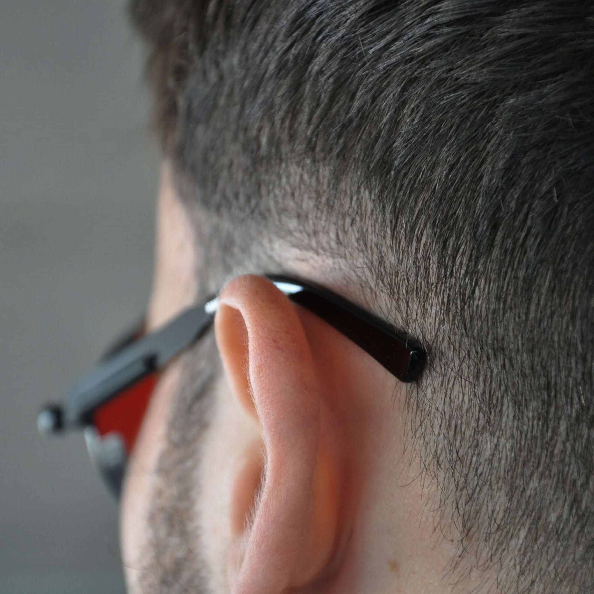 Czarno-czerwone okulary przeciwsłoneczne z obudowaną soczewką
