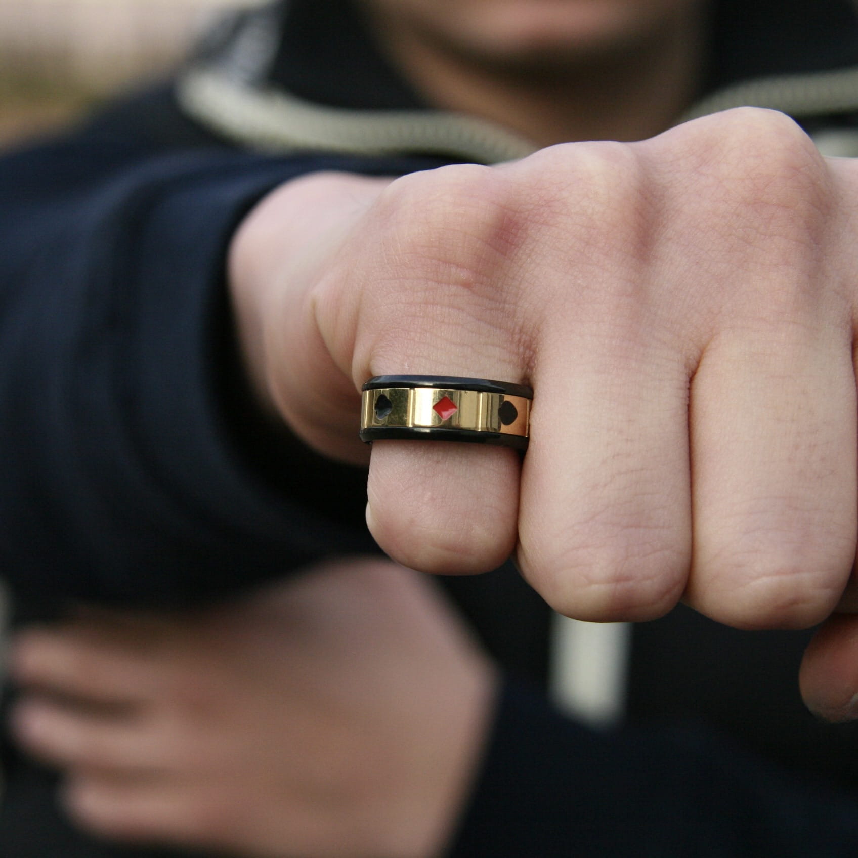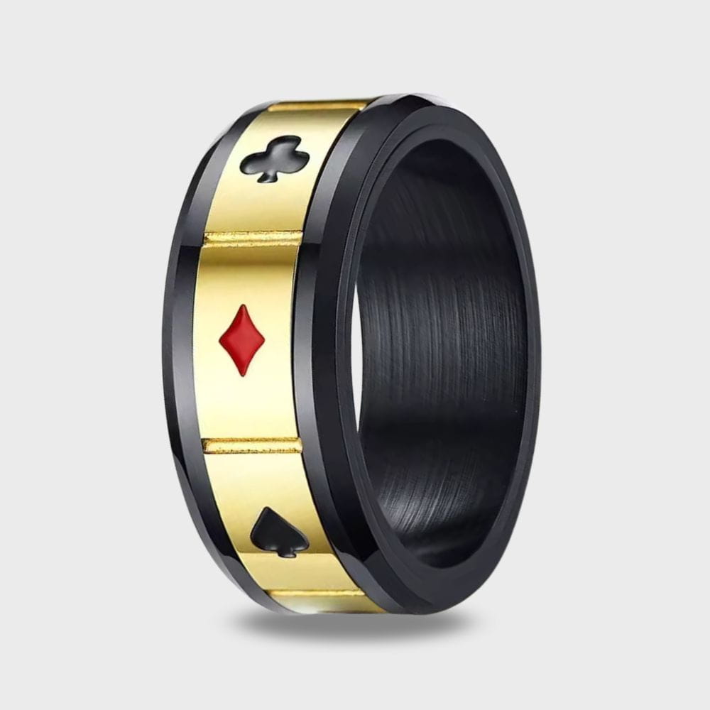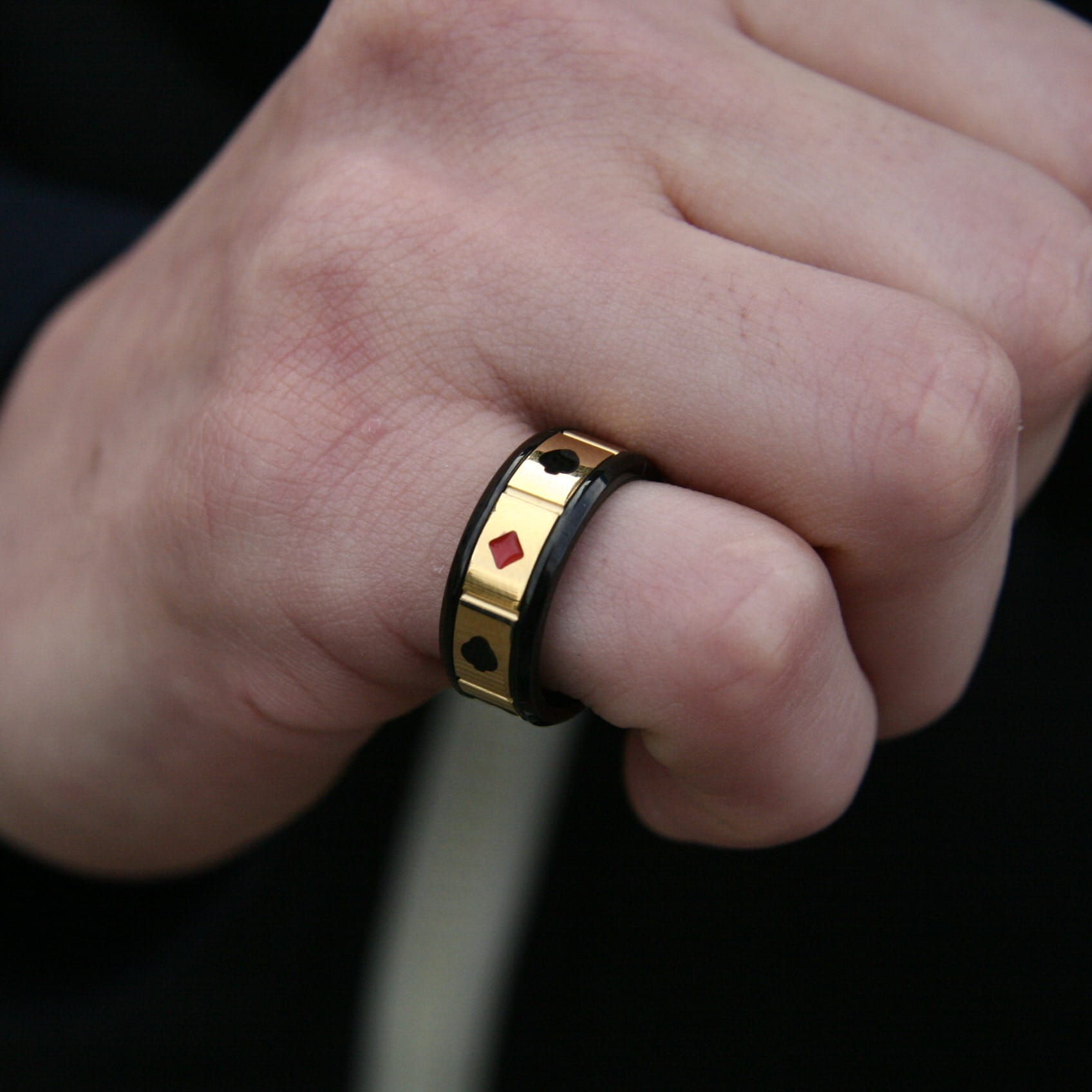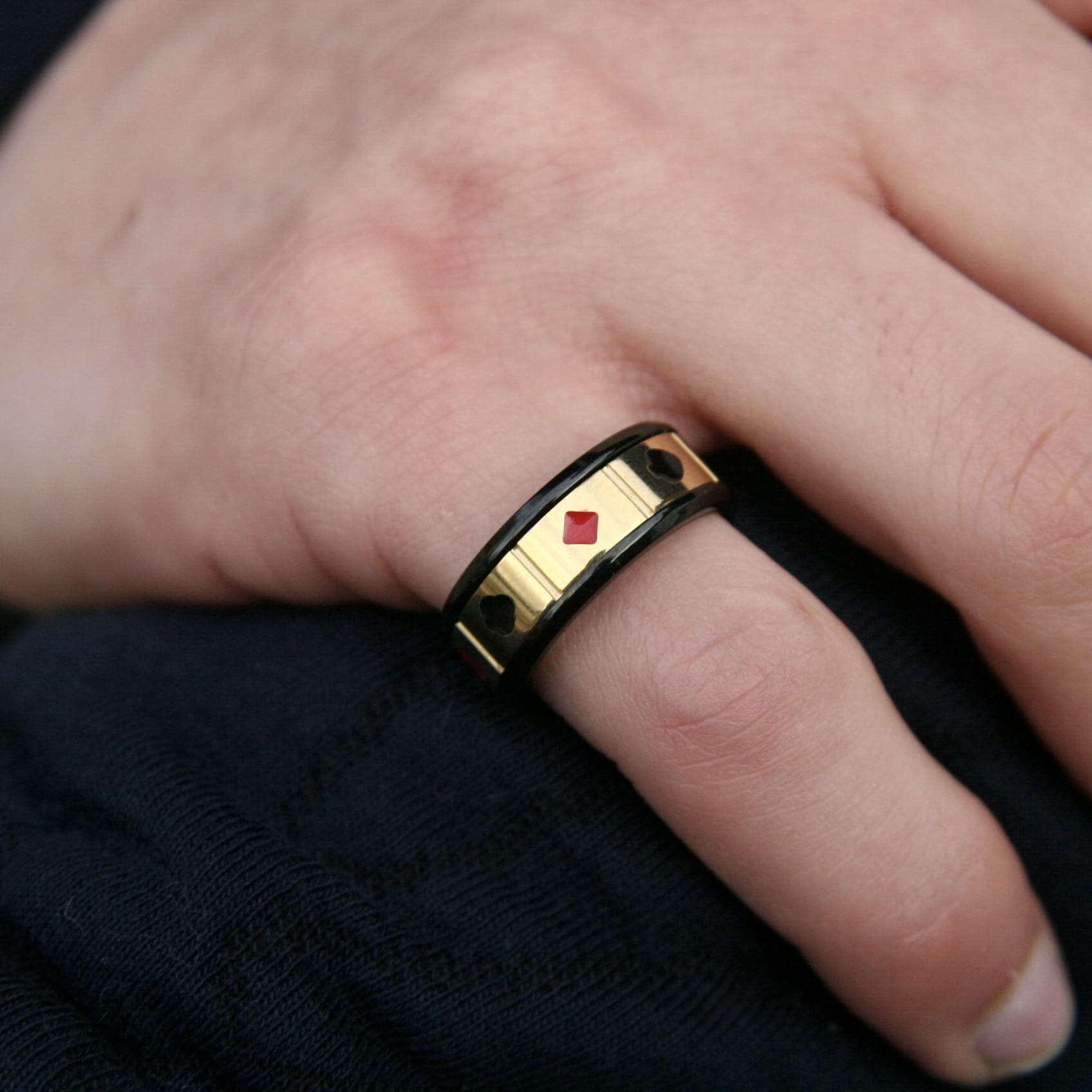 Czy czujesz się dziś na tyle szczęśliwy, aby rzucić wyzwanie losowi? Ten pierścień ze stali szlachetnej, ozdobiony symbolami z talii kart, to idealny męski dodatek dla każdego, kto lubi styl z nutą ryzyka.