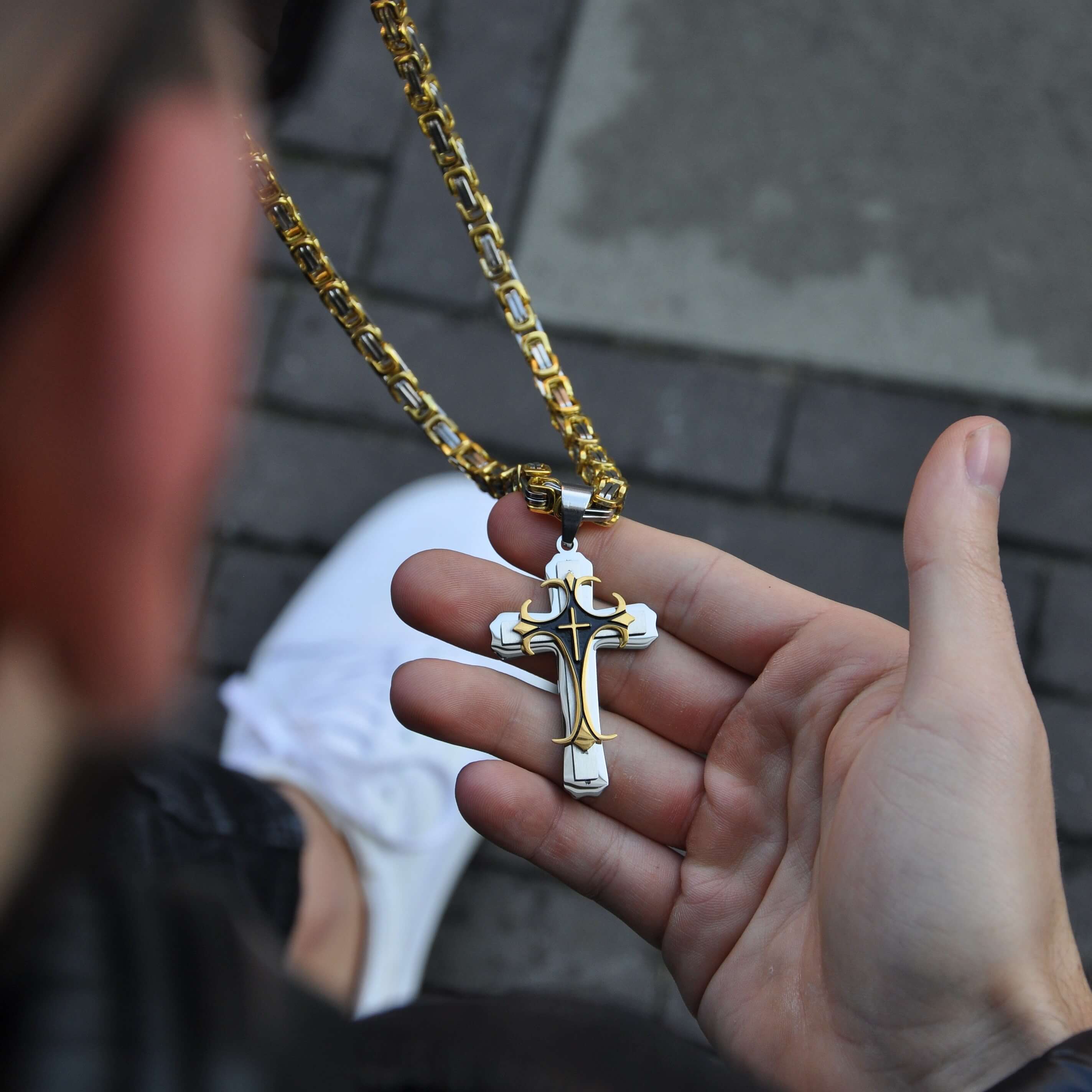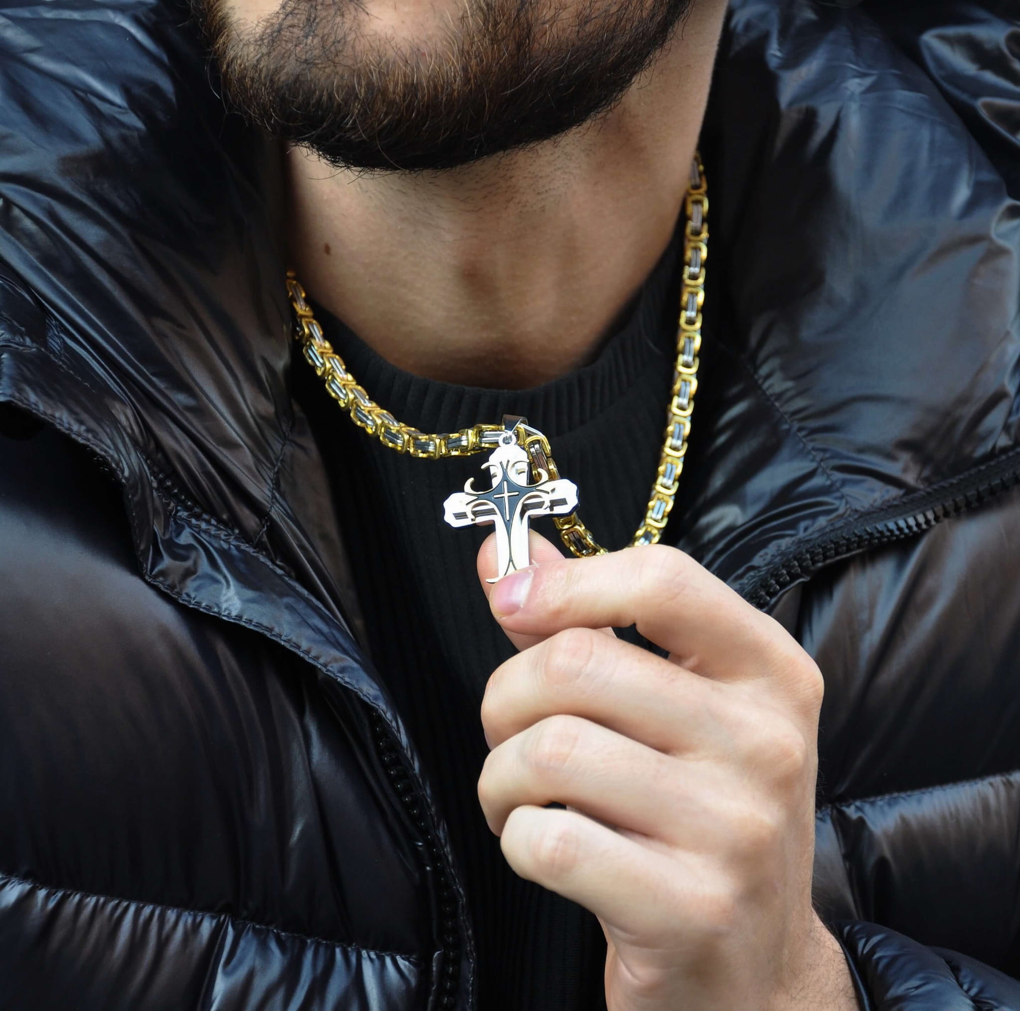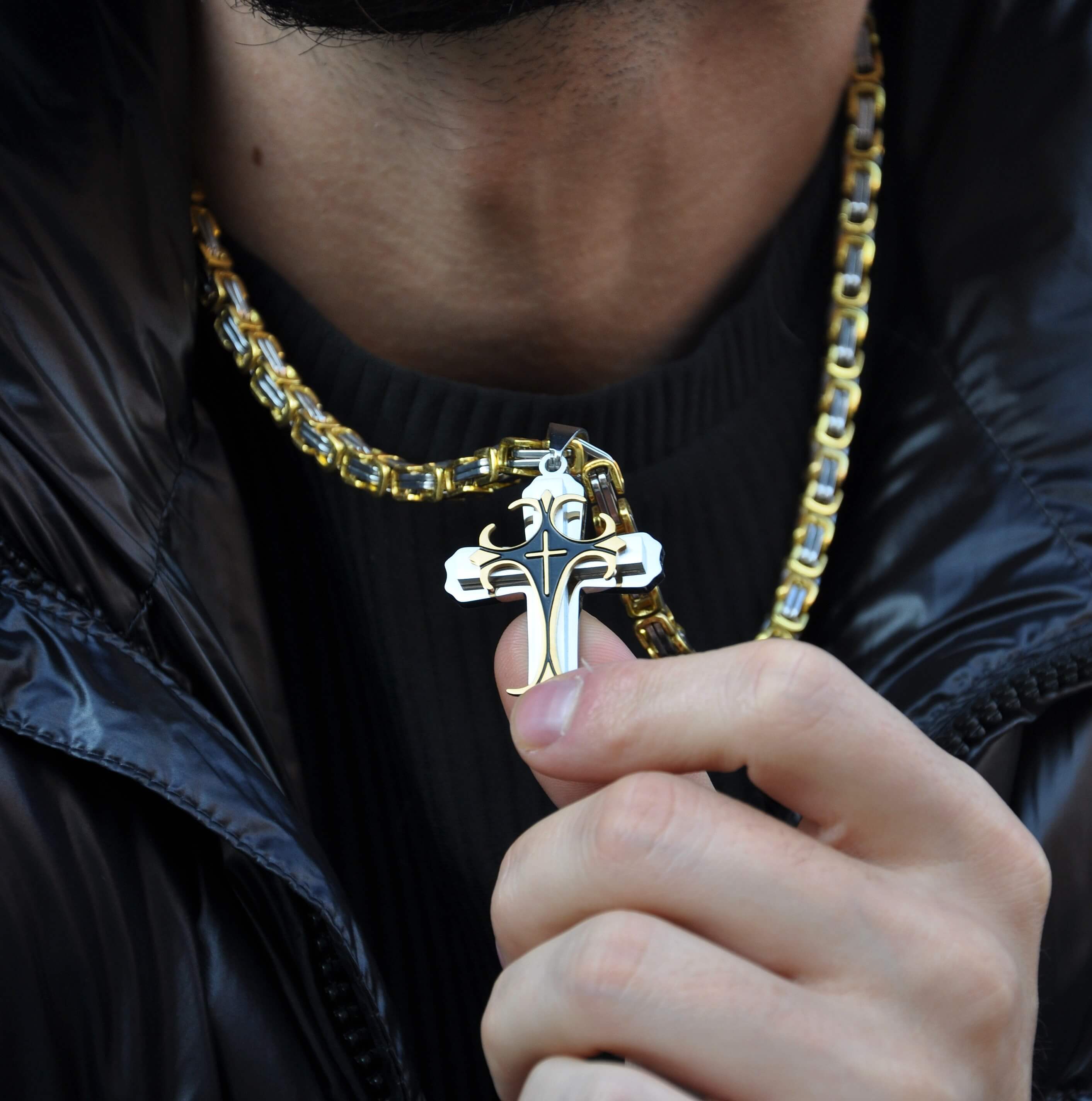 Naszyjnik ze stali szlachetnej z ekskluzywnym połączeniem srebrnego i złotego koloru mógłby być bohaterem wielu męskich rozmów przy kawie. "Czy to prawda, że złoto na krzyżu jest prawdziwe?" – pytają zazwyczaj zaciekawieni, na co noszący naszyjnik mężczyzna, z lekkim uśmiechem odpowiada: "Złoto to nie wszystko, co się liczy."