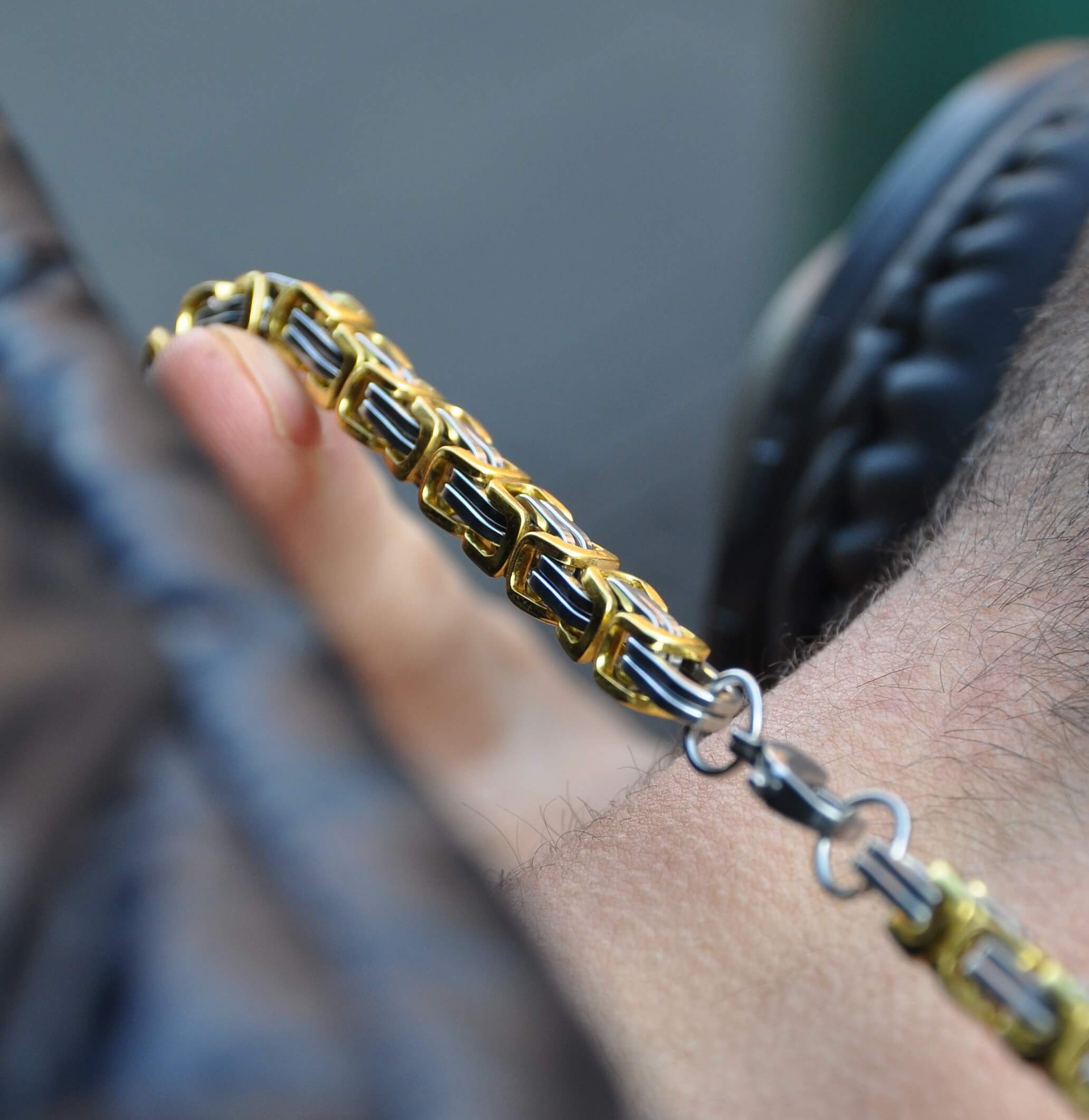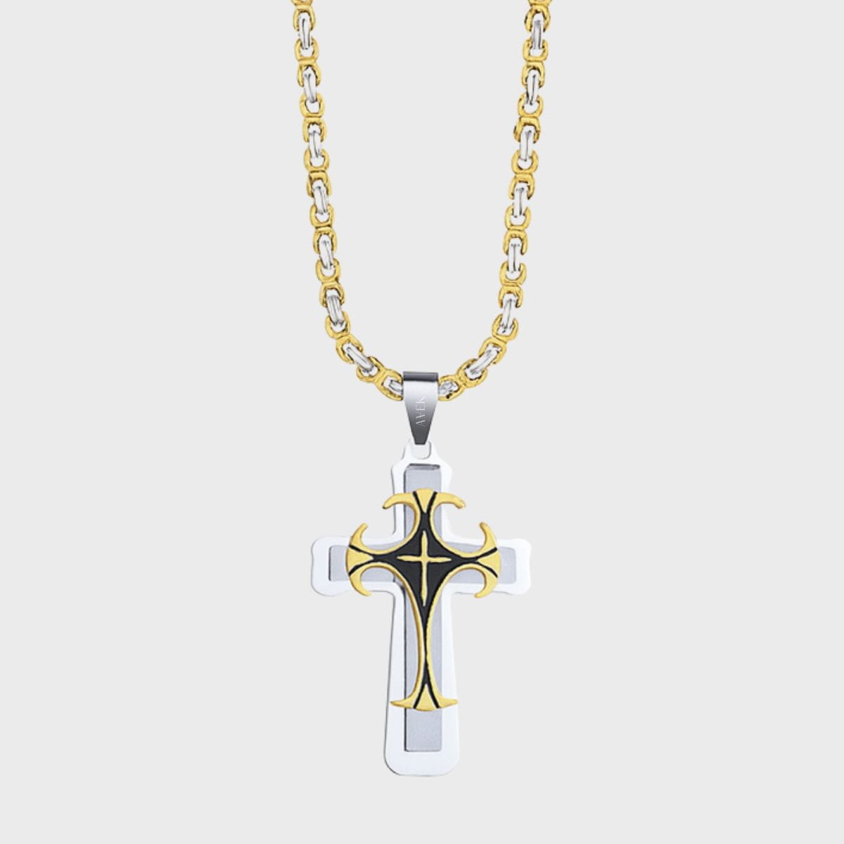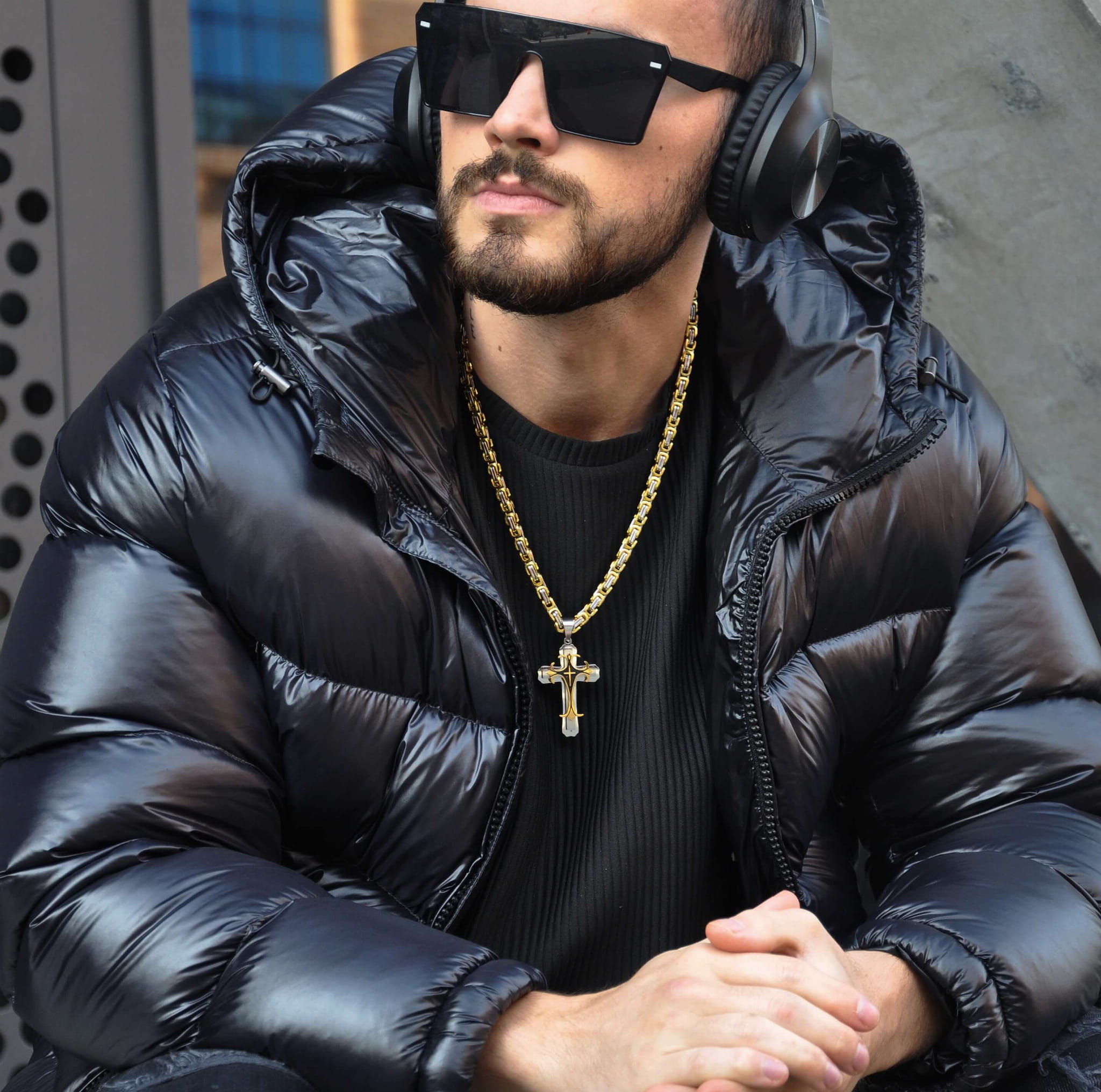 Naszyjnik ze stali szlachetnej z ekskluzywnym połączeniem srebrnego i złotego koloru mógłby być bohaterem wielu męskich rozmów przy kawie. "Czy to prawda, że złoto na krzyżu jest prawdziwe?" – pytają zazwyczaj zaciekawieni, na co noszący naszyjnik mężczyzna, z lekkim uśmiechem odpowiada: "Złoto to nie wszystko, co się liczy."