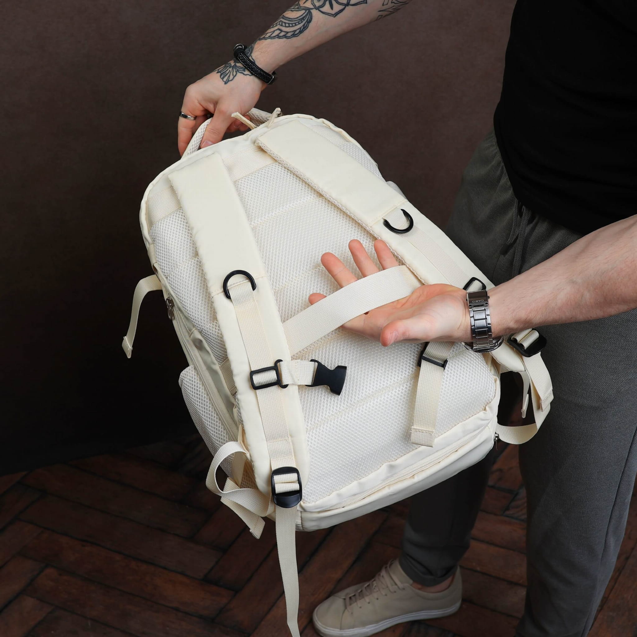 Ma coś z walizki, coś z torby, a przy tym nosi się jak klasyczny plecak miejski z funkcją organizera. Kabel od powerbanka wychodzi z boku, więc w metrze ładujesz telefon, udając, że to wcale nie jest najbardziej praktyczna rzecz, jaką masz ze sobą. Sprytny, pojemny i nie rzuca się w oczy – czyli dokładnie taki, jaki powinien być towarzysz codziennych i tych mniej codziennych wypraw.