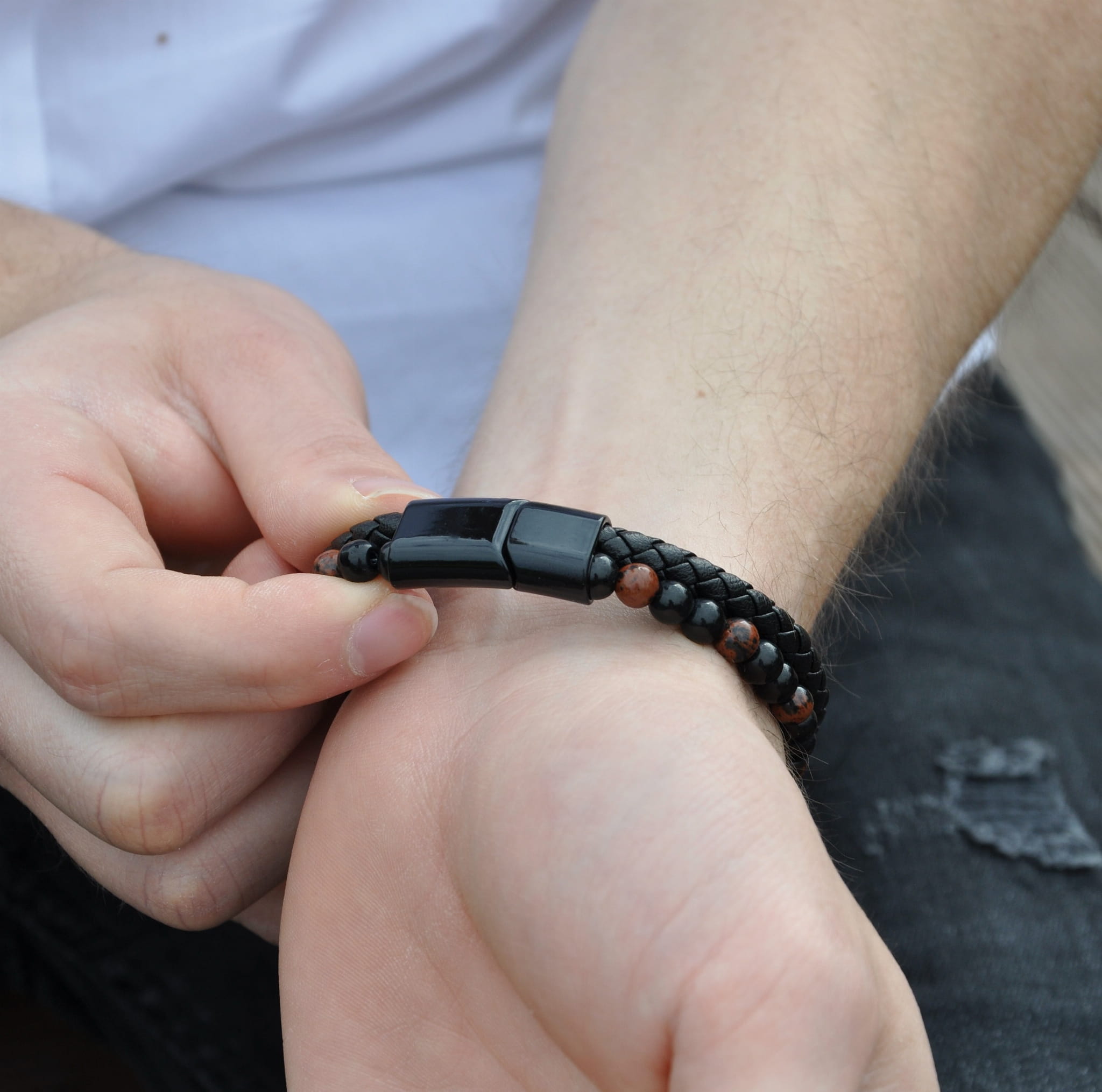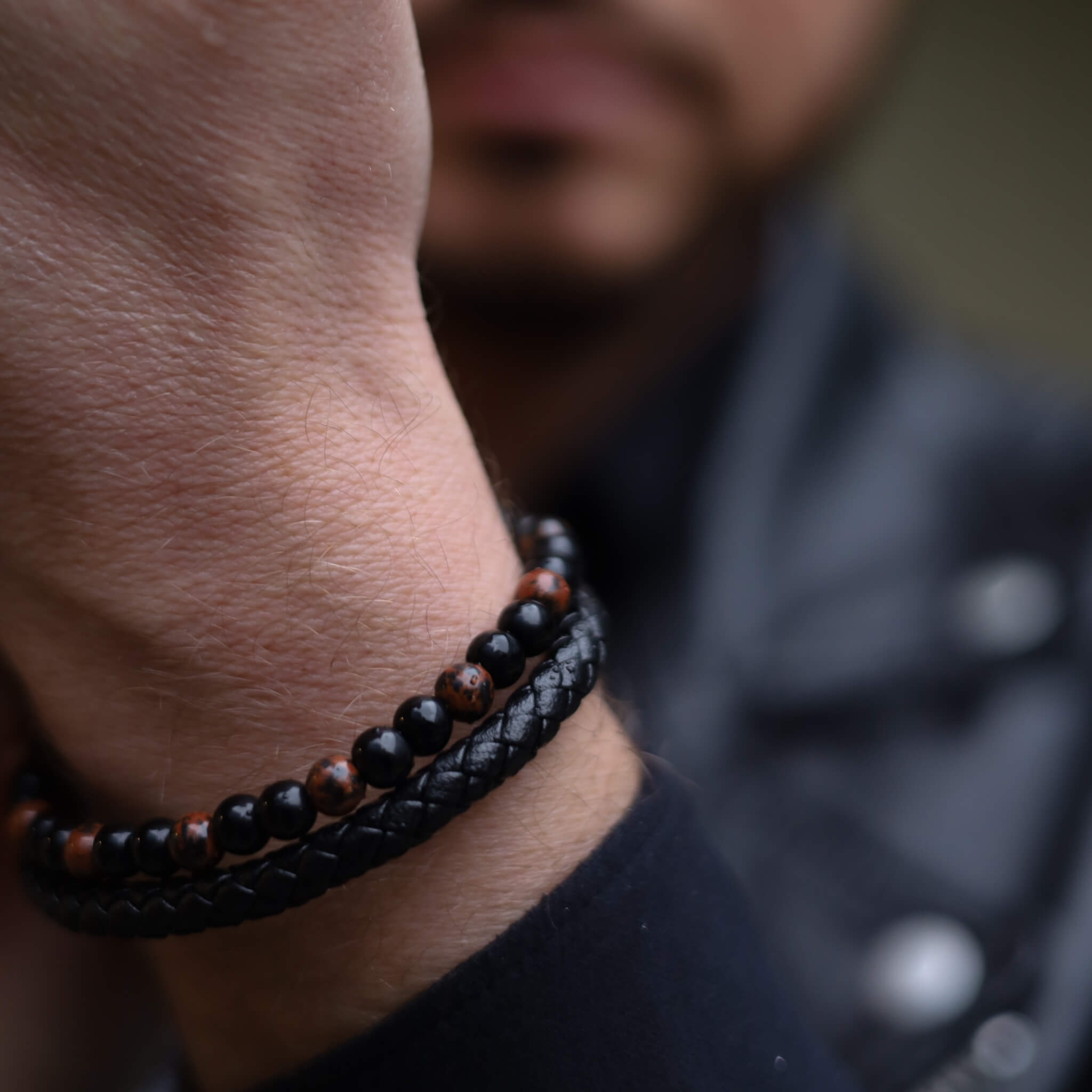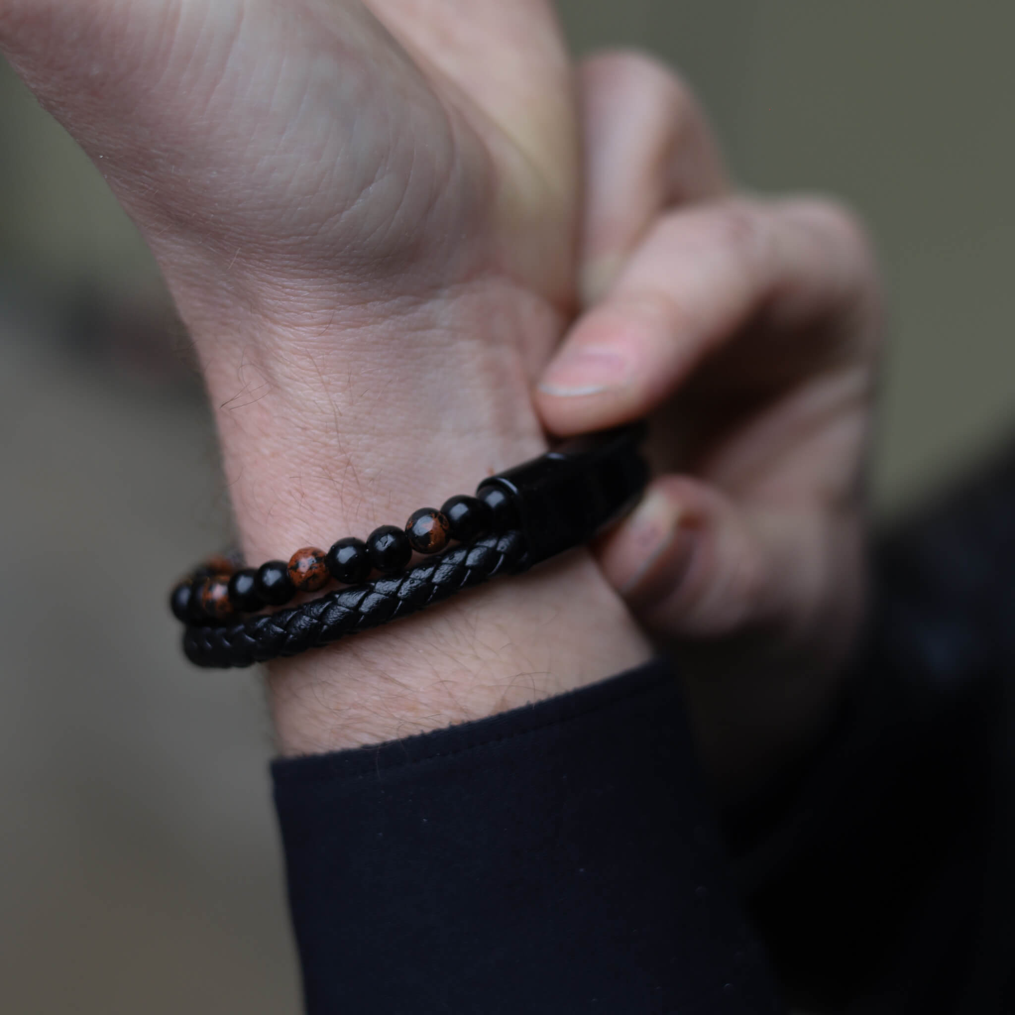 Ta bransoletka skórzana, spleciona z czarnej skóry i zdobiona mahoniowymi koralikami, przypomina o cieple ogniska podczas chłodnych, gwiaździstych nocy. Jej głębokie, ziemiste odcienie niosą w sobie spokój lasów, które niegdyś były domem dla dawnych podróżników.