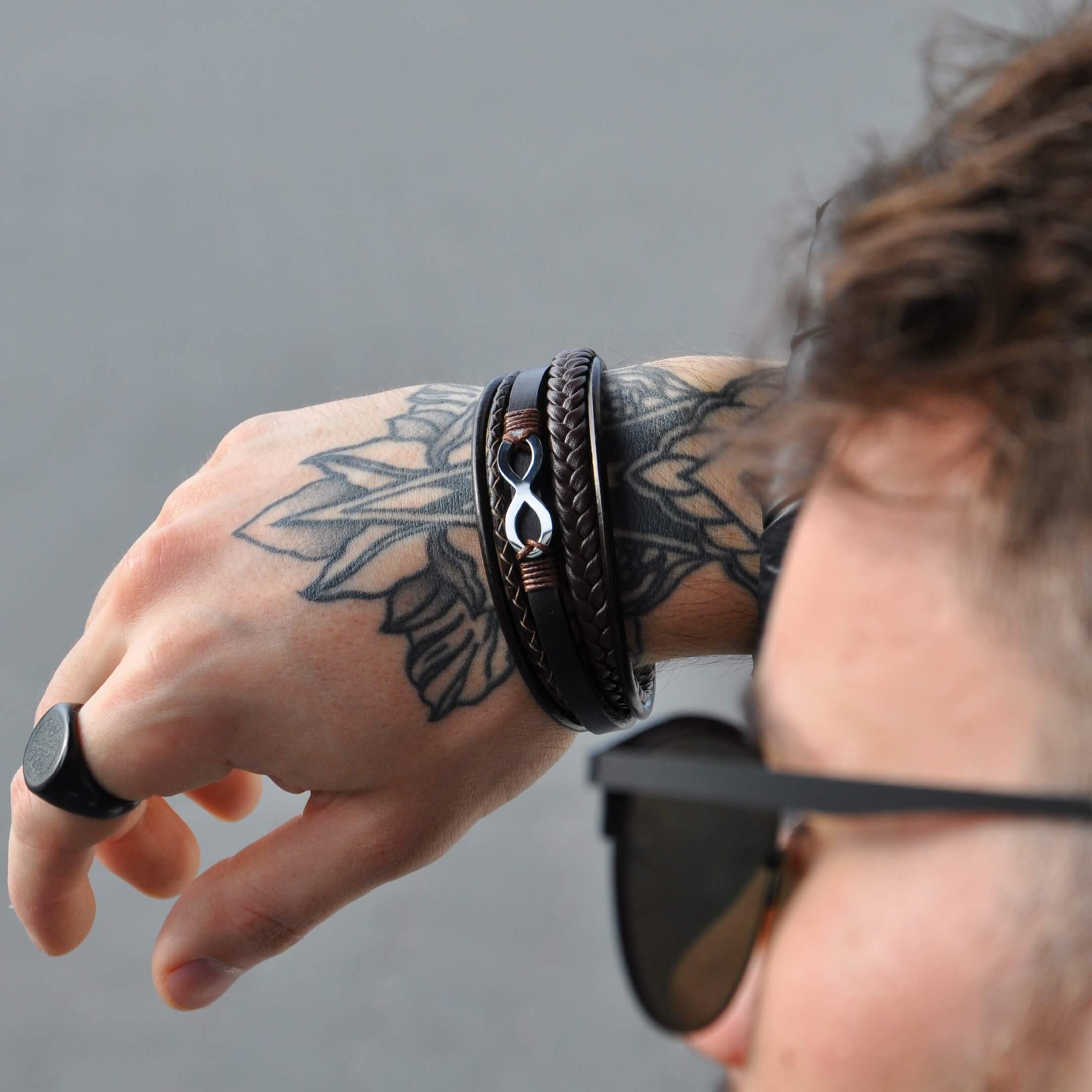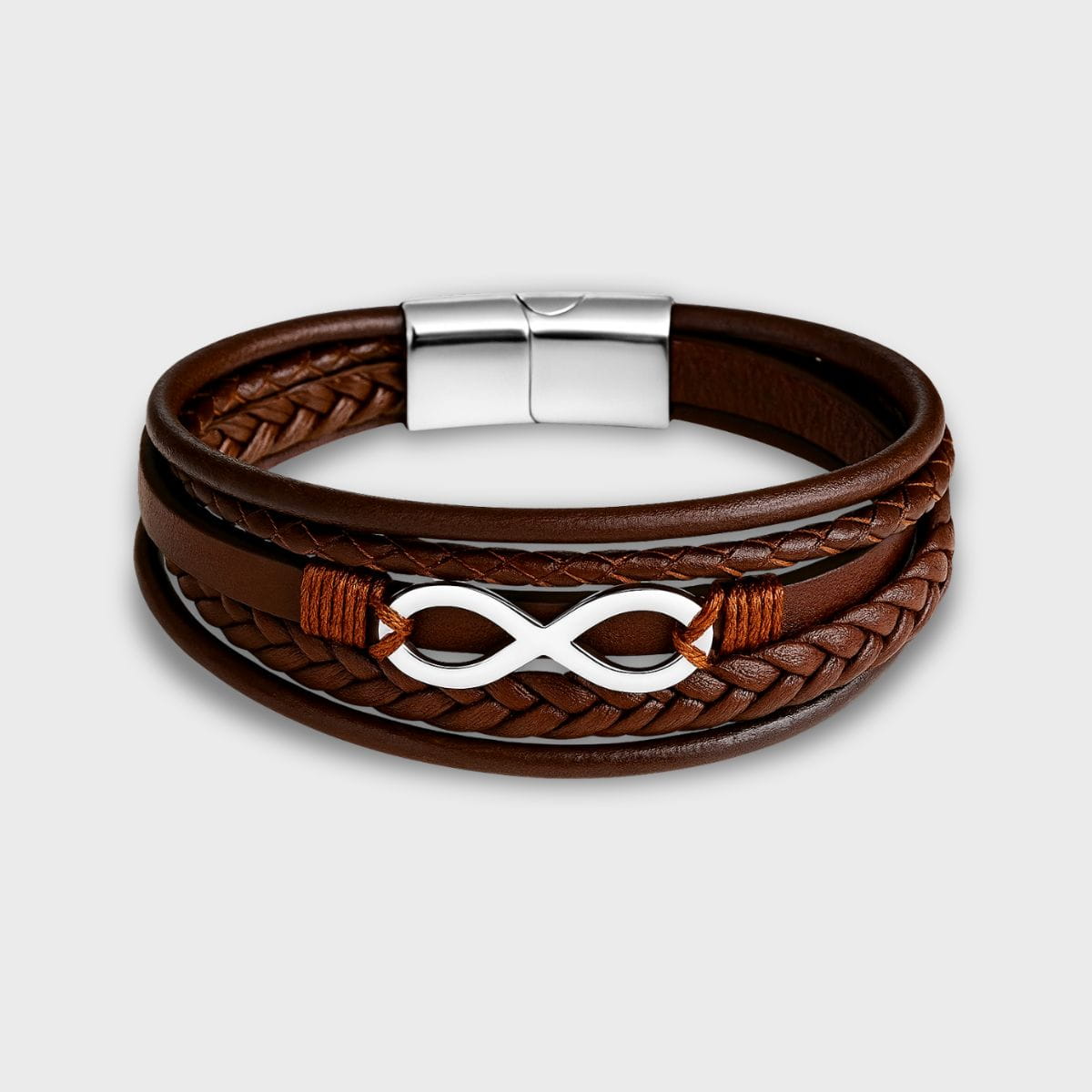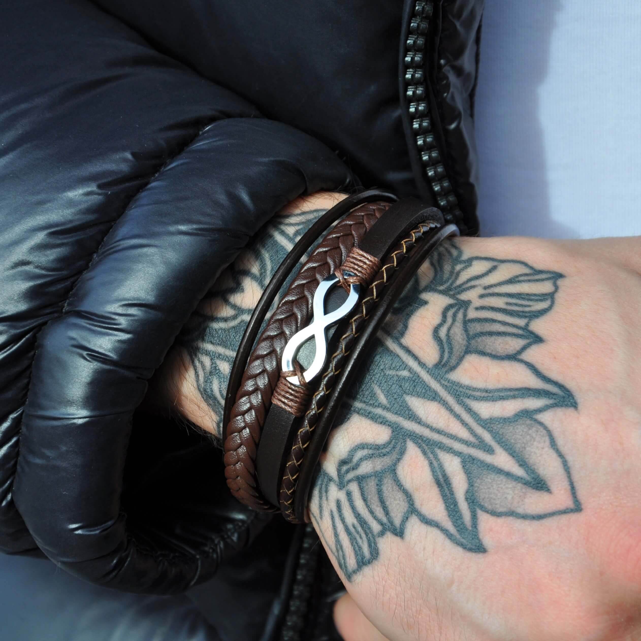 Subtelnie tkane skórzane pasy tej bransoletki splatają się w symbol nieskończoności, przypominając o ciągłości i nieprzerwanych więzach z naszą historią. Każdy detal, od lśniącego srebrnego zapięcia po starannie wykonane plecionki, opowiada o rzemiośle i elegancji.
