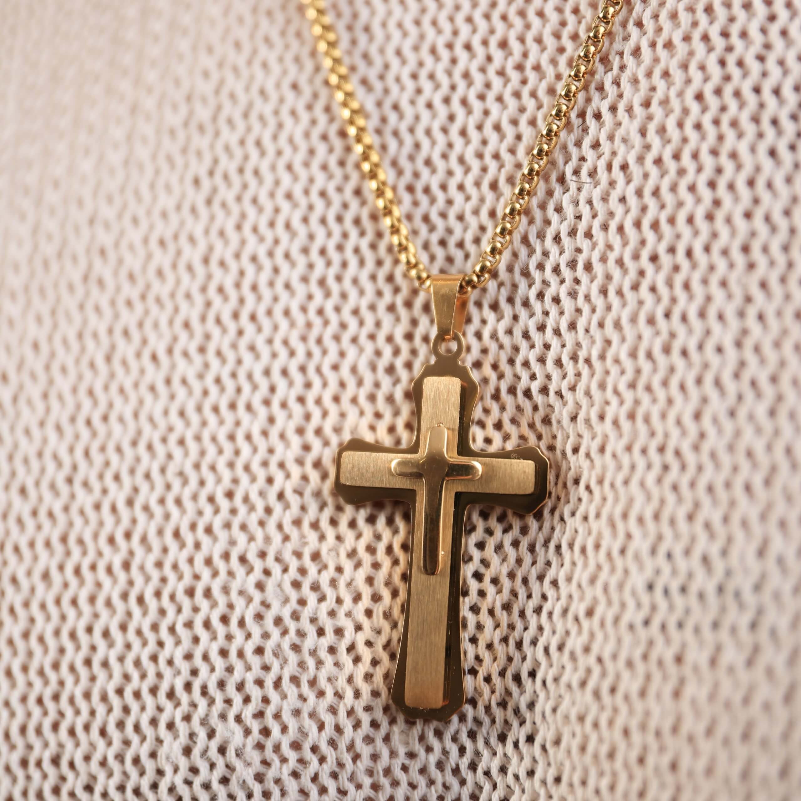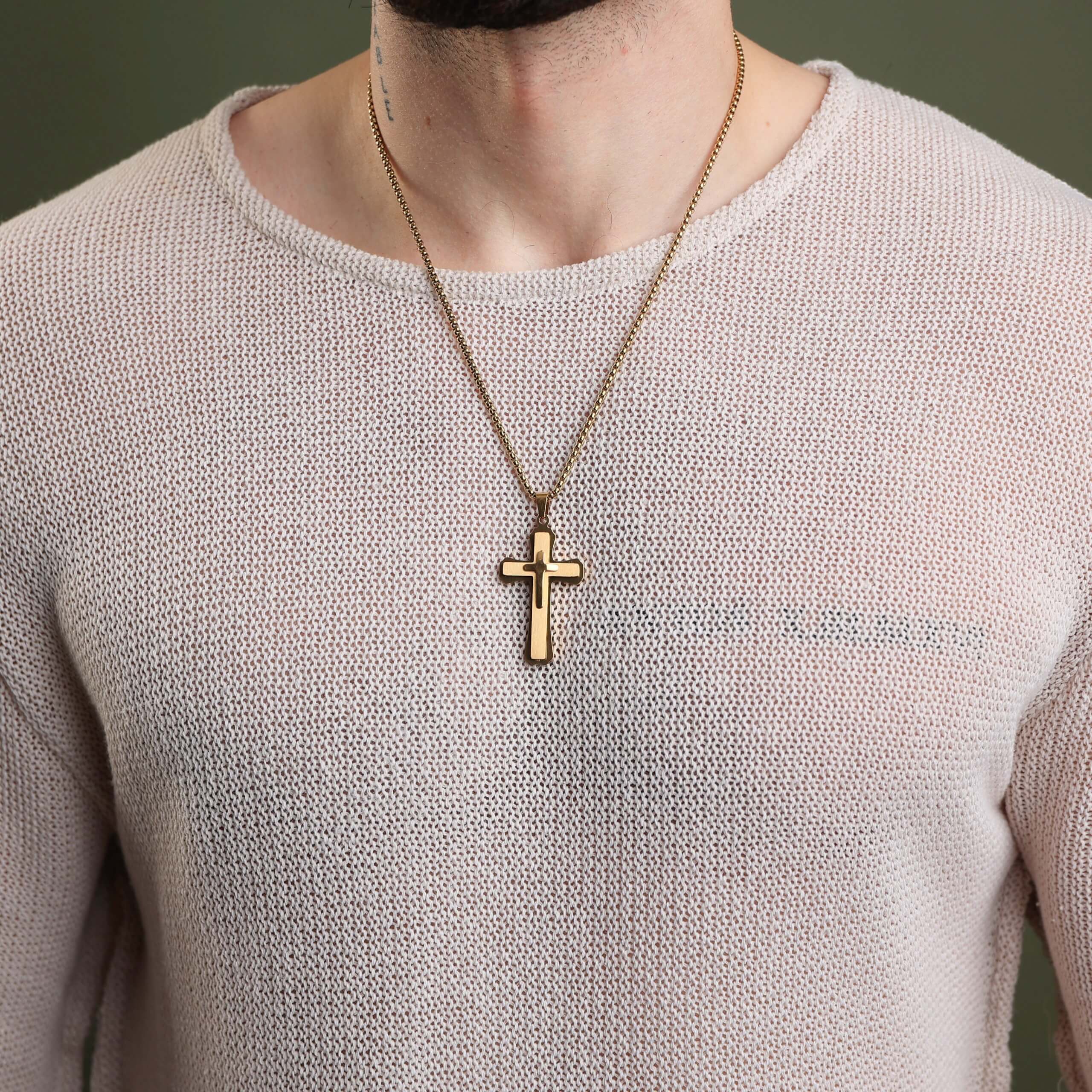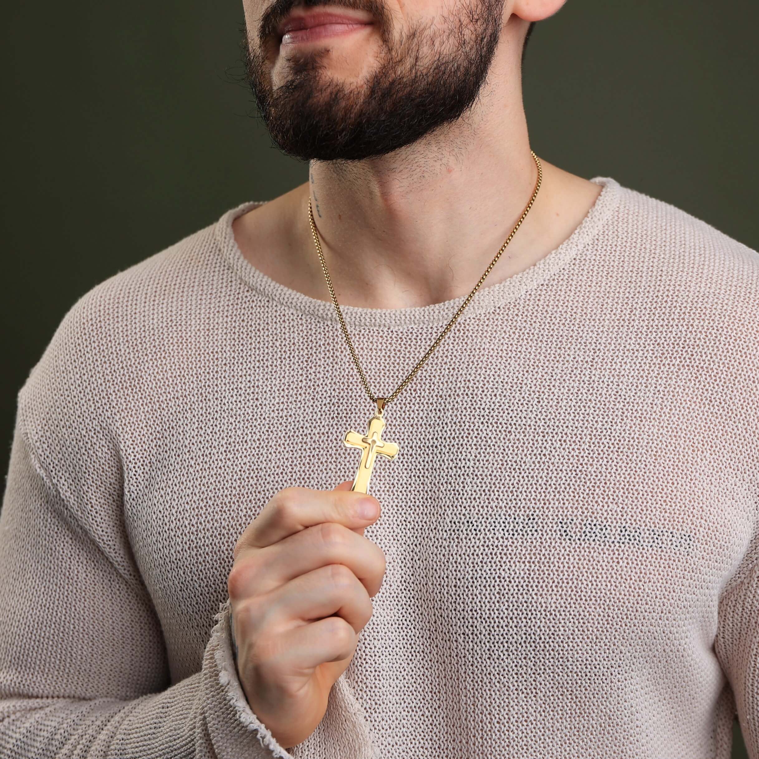 Złocisty naszyjnik męski z podwójnym krzyżem
