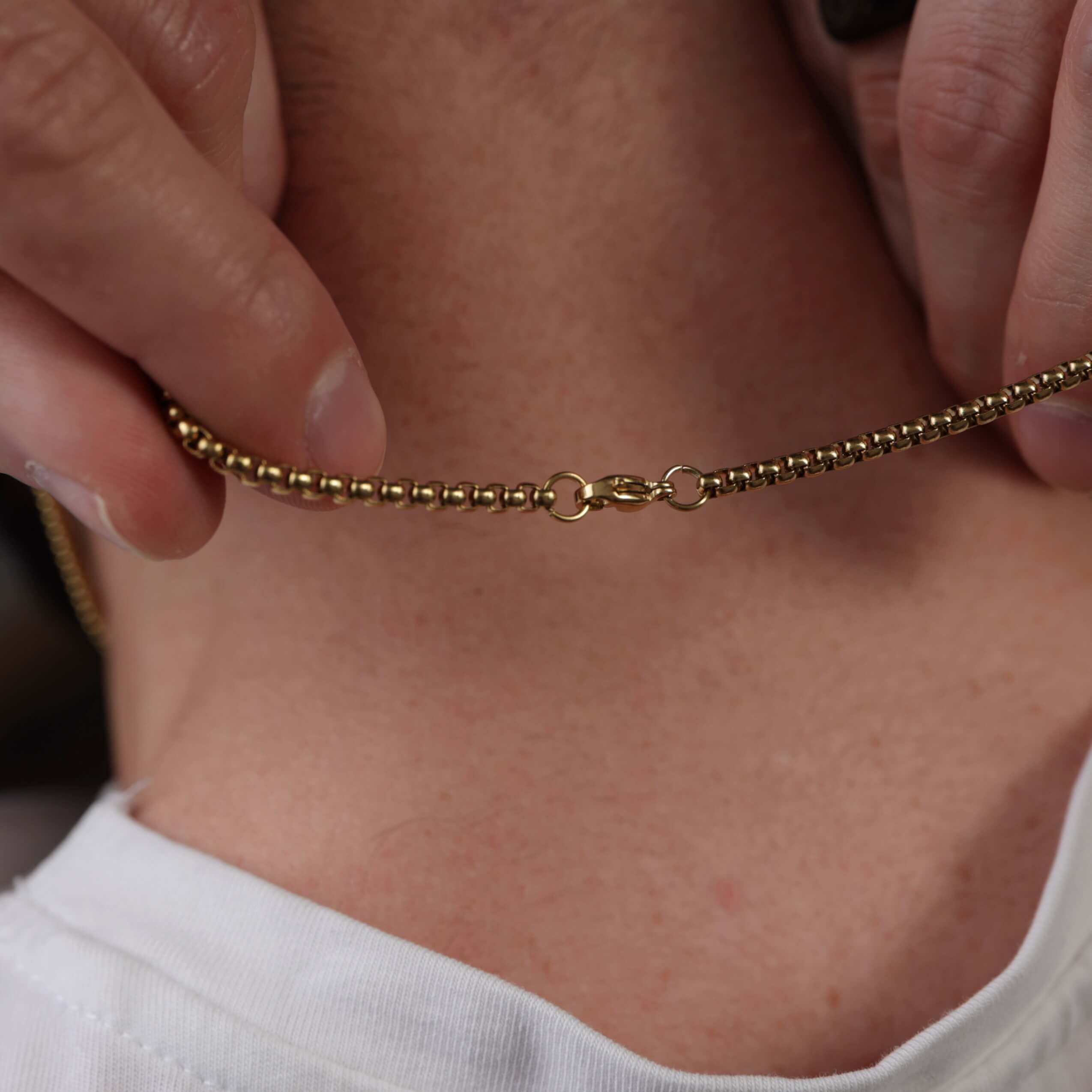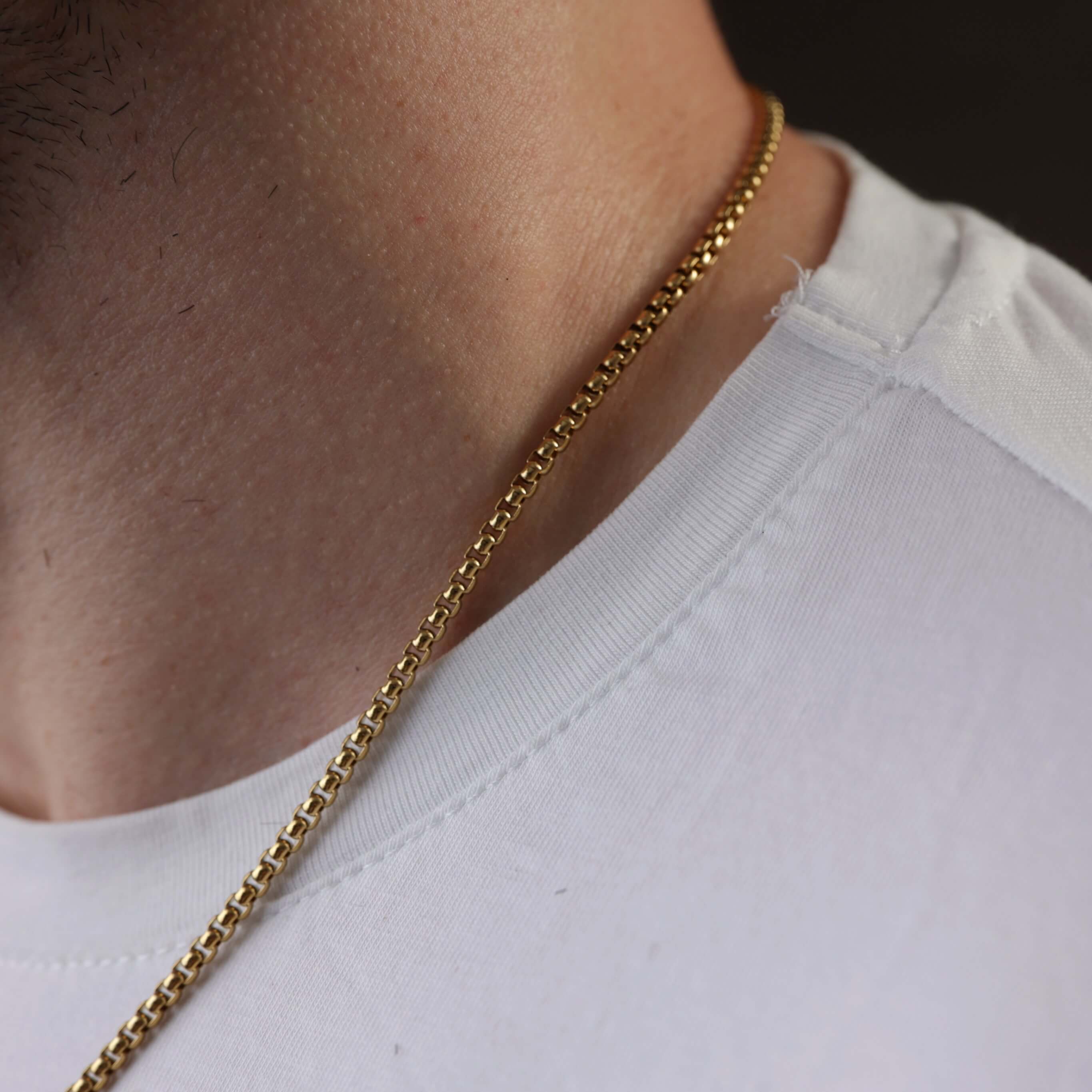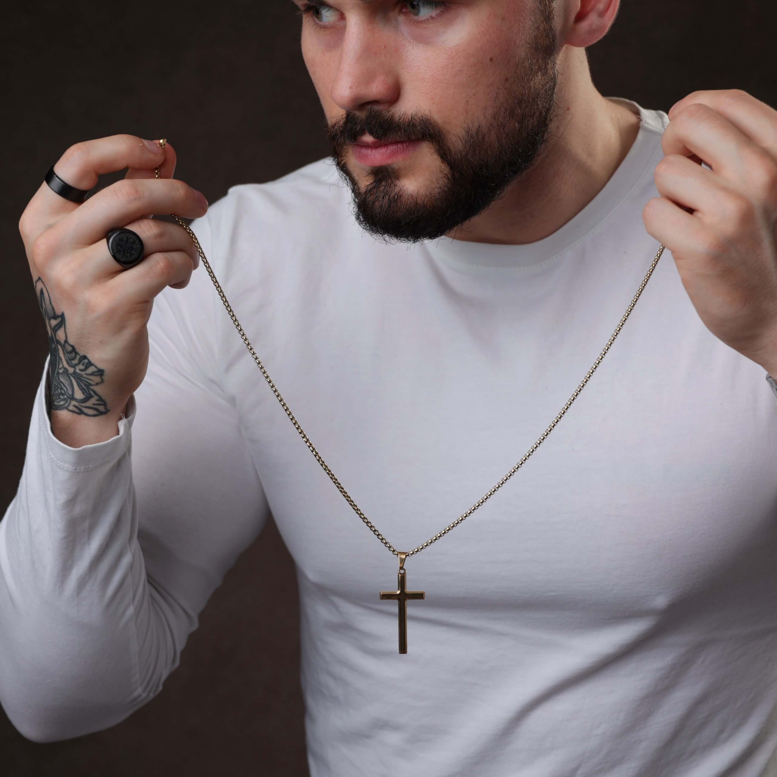 Złoty połysk naszyjnika symbolizuje światło – towarzysza w ciemności, znak nadziei i duchowej obecności. To biżuteria dla mężczyzny, który nie musi krzyczeć, by być słyszanym. Dla tego, który wybiera minimalizm z przesłaniem.